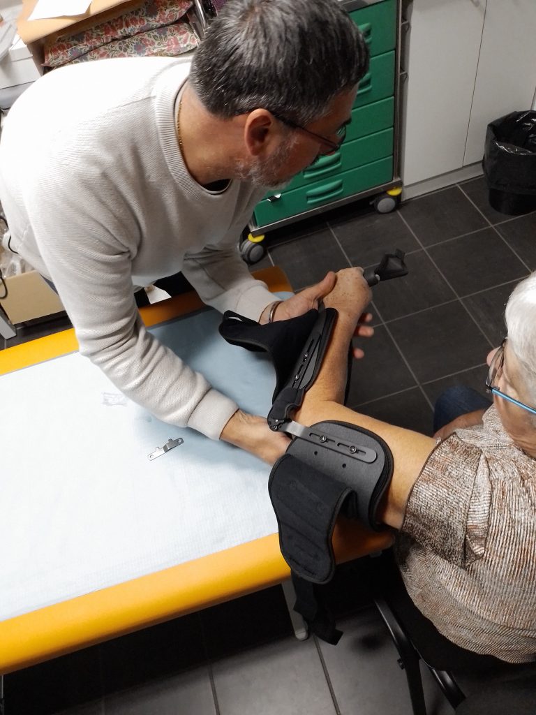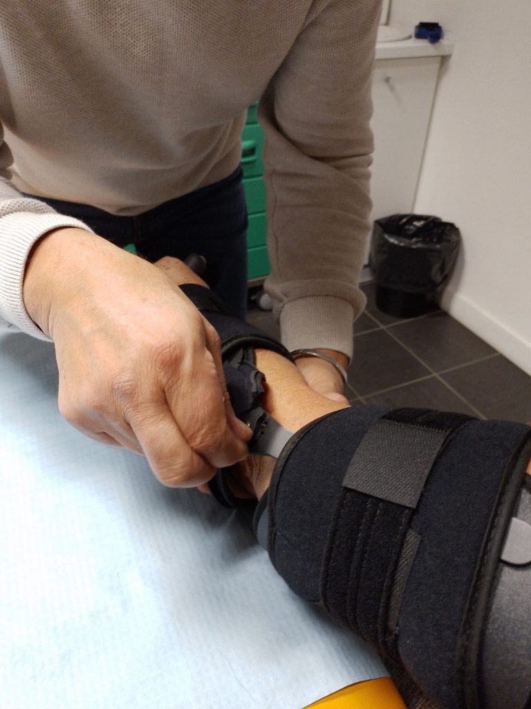 Notre orthopédiste positionne l’attelle sur le bras.